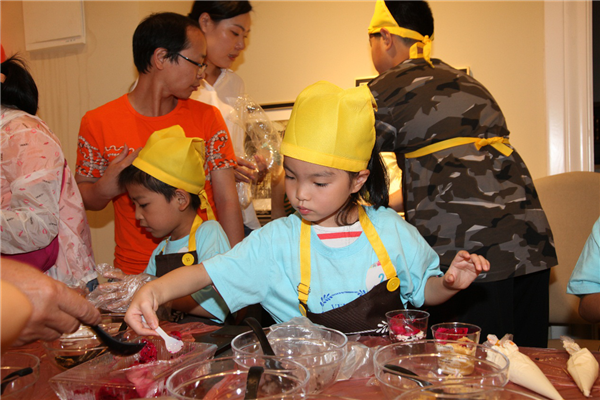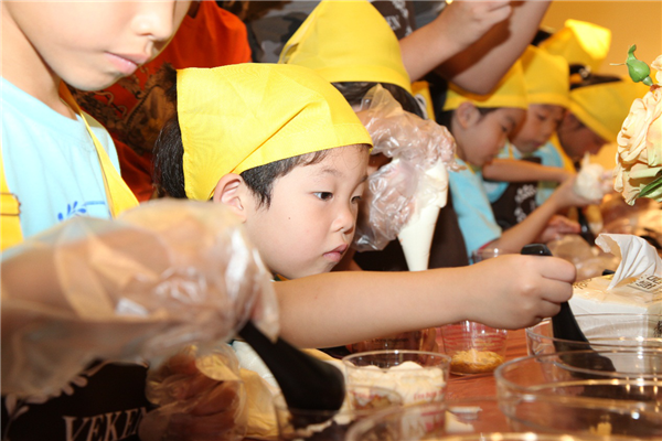 鋪上薄薄的一層餅干碎,擠上一層厚厚的奶油,再鋪上一層餅干碎,再擠上一層奶油……看似簡(jiǎn)單的操作,著實(shí)讓小朋友們手忙腳亂了一番,這倒是樂(lè)壞了旁邊本就蠢蠢欲動(dòng)的家長(zhǎng)們,紛紛上手親自操刀原本就不大的場(chǎng)地顯得更加熱鬧擁擠。